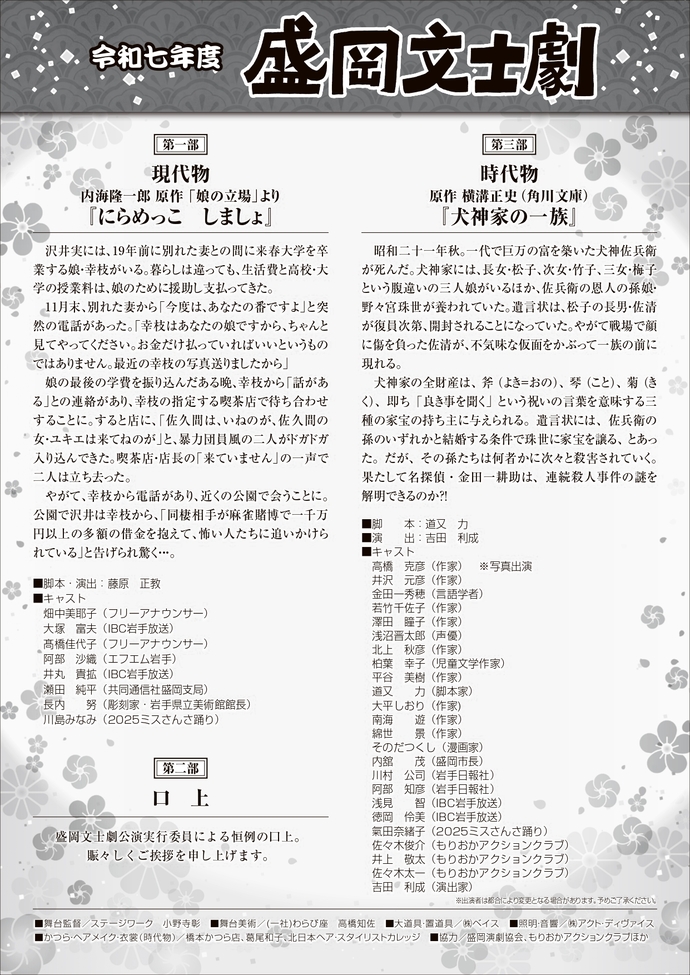 地元各局のアナウンサーらが盛岡弁で繰り広げる現代劇、実行委員による口上、盛岡に縁のある作家らと地元各界名士による時代劇をお楽しみください。