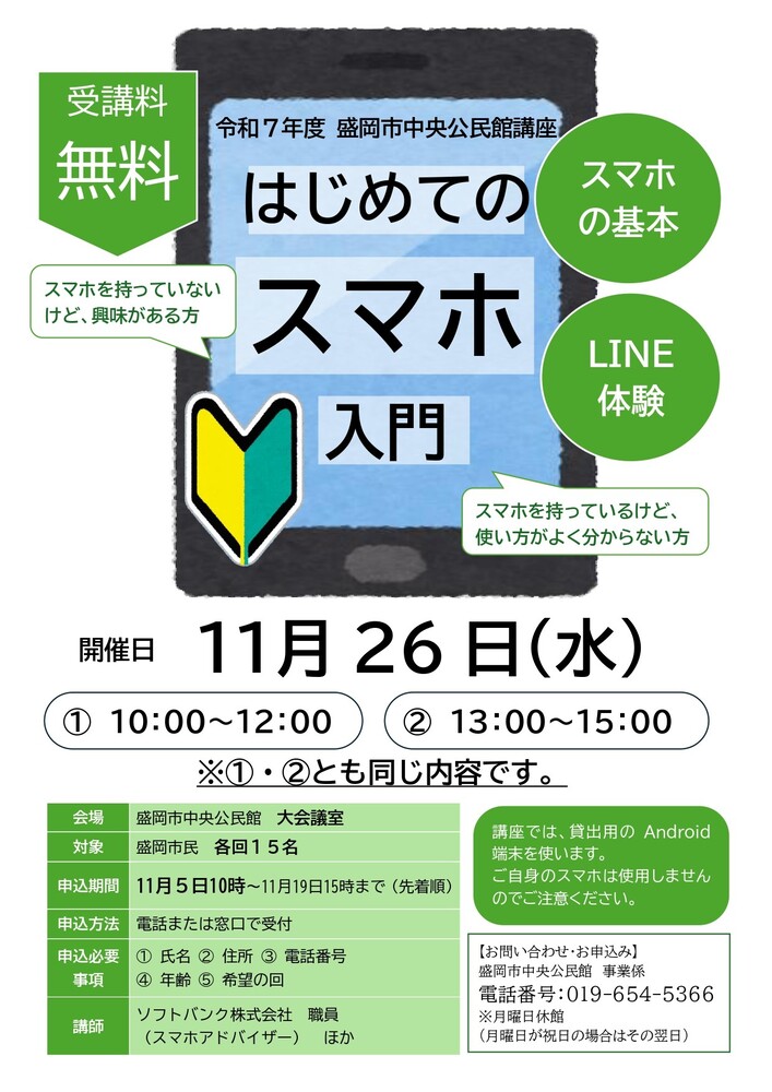 (4)電話番号(5)年齢(6)受講希望回(午前・午後)上記必要事項を、中央公民館窓口または電話(電話番号:019-654-5366)で申し込み願います。