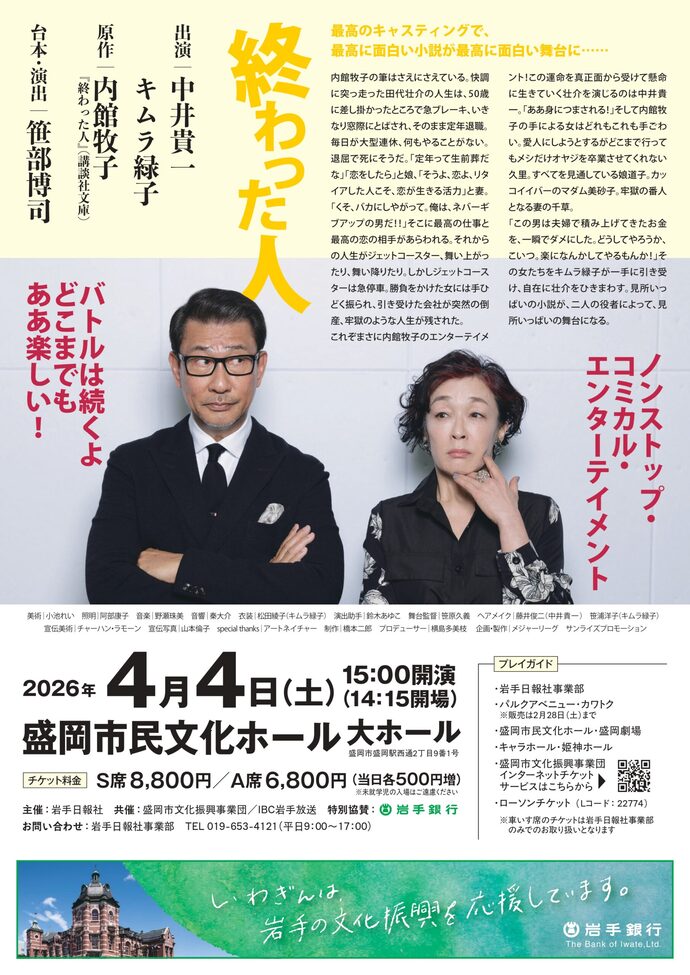 内館牧子(うちだて まきこ)原作の終活小説「終わった人」が、実力派俳優中井貴一(なかい きいち)・キムラ緑子(みどりこ)によるリーディングドラマとして実現。定年という人生の転機を軽やかに描き、人生の後半戦をどう生きるかを問いかける本作は、笑いと感動を届ける見どころ満載の舞台となります。