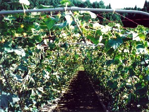 盛岡市内ではきゅうりは限られた面積で高収益が期待できる農作物として、野菜の中ではもっとも盛んに栽培されています。夏期の露地栽培が中心ですが、最近は収穫を早めることができるビニールハウスによる栽培もふえています。