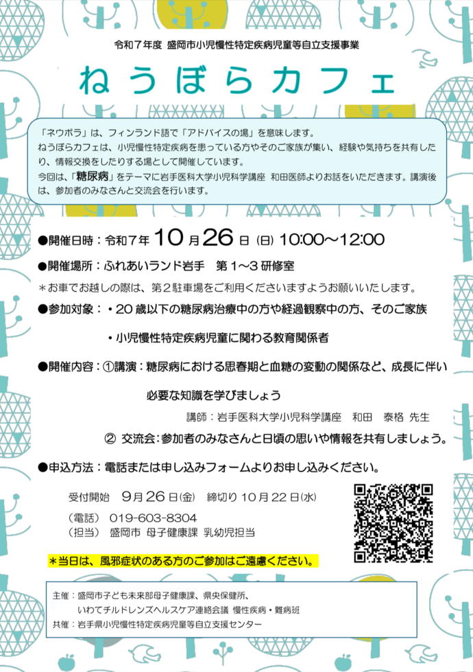 ねうぼらカフェは、小児慢性特定疾病を患っている方やそのご家族が集い、経験や気持ちを共有したり、情報交換したりする場として開催しています。