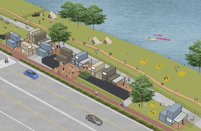 北上川河川敷と一体的に活用することを目指しており、居心地のいい場所で美味しいものを食べたり、水辺を散歩したりと、寄り道したくなる場所です。