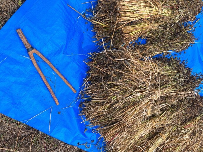 現在、地域内の休耕地を借りて地域の皆さんに教わりながら特産品の蕎麦を栽培しています。地域に伝わる昔ながらの方法で、蕎麦は鎌で手刈りして束ねて、二週間ほど天日干しをします。脱穀の際は「まどり」という木の道具を使って蕎麦の実をたたき落としています。