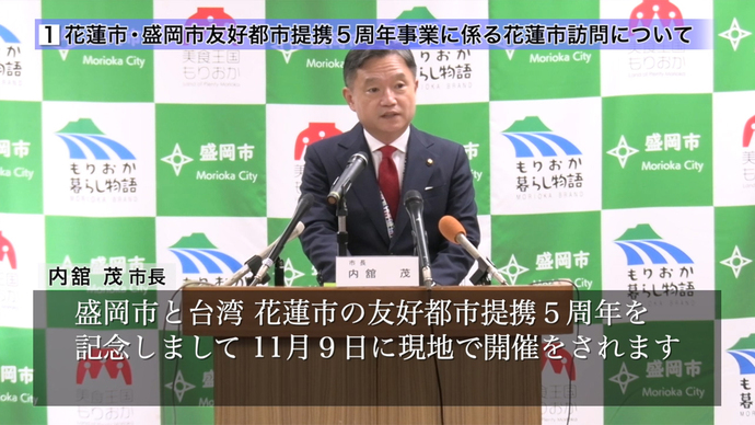 盛岡市と台湾、花蓮市の友好都市提携5周年を記念しまして、11月9日に現地で開催されます「2024花蓮加油(ジィァーヨゥ)~盛岡山車カーニバル~」に合わせまして花蓮市を訪問してまいります。訪問するのは、公式訪問団をはじめ、市議会議員団、市民訪問団など、全体で約100名となります。11月の7日から11月11日まで、花蓮縣庁、花蓮市長への表敬訪問、記念植樹、そして盛岡りんごフェアでのトップセールス、盛岡山車パレードなどを予定しております。そして、台北で、台湾交通部の観光署にも寄ってまいりまして、観光についてのトップセールスを行ってまいります。花蓮は令和6年4月に台湾東部沖、大きな地震が起こりました。地震が起こって3日後、4日後でしたか、避難場所から花蓮の市長とオンラインでお話をしました。その時は、まだ状況が分からなくて大変だと、疲れた顔でしたけれども、約1か月後にオンラインでお話をしました時には、だいぶ街も通常に戻ってきたと。ただ、当時太魯閣(タロコ)渓谷が完全閉鎖になっておりまして、観光が大打撃だということで、その時点で私も市役所の職員、議員、市民の皆さんと、11月どうしたらいいかなと考えておりましたけれども、花蓮市長の方から、8月には盛岡にぜひ行きたい、そして観光を何としても盛り上げていきたいので、11月のパレードは必ずやるので何とか来てくれと、そういう話もありまして、皆さんとも協議をして今回訪問することにしたところであります。市民の皆さんの気持ちも、花蓮を応援しているよという気持ちも届けていきたいと思っております。